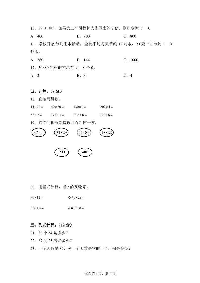 青岛63版数学三年级下册第三单元《两位数乘两位数》综合能力检测卷 青岛63版数学三年级下册第三单元《两位数乘两位数》综合能力检测卷