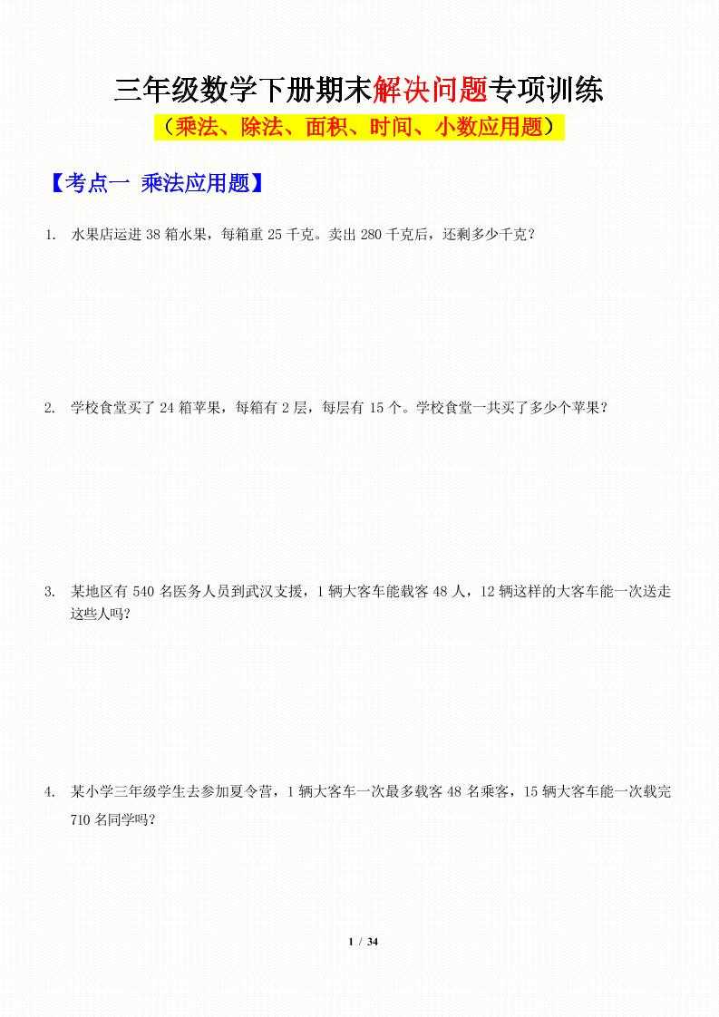 三年级下数学应用题-期末解决问题专项训练 三年级下数学应用题-期末解决问题专项训练