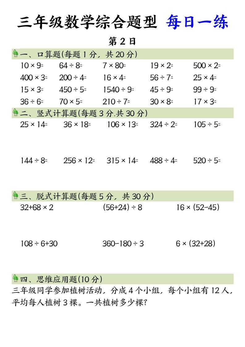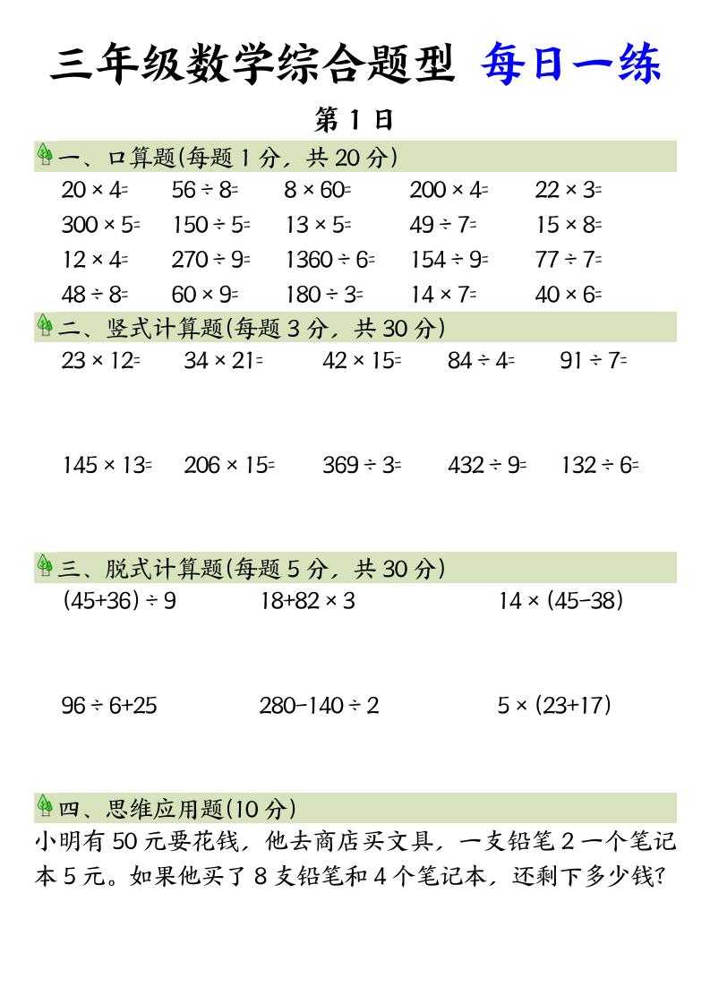 三年级数学综合题型+每日一练三下数学 三年级数学综合题型+每日一练三下数学