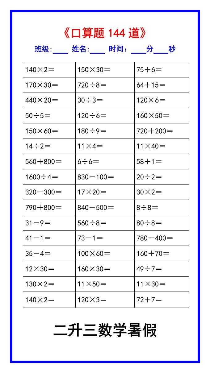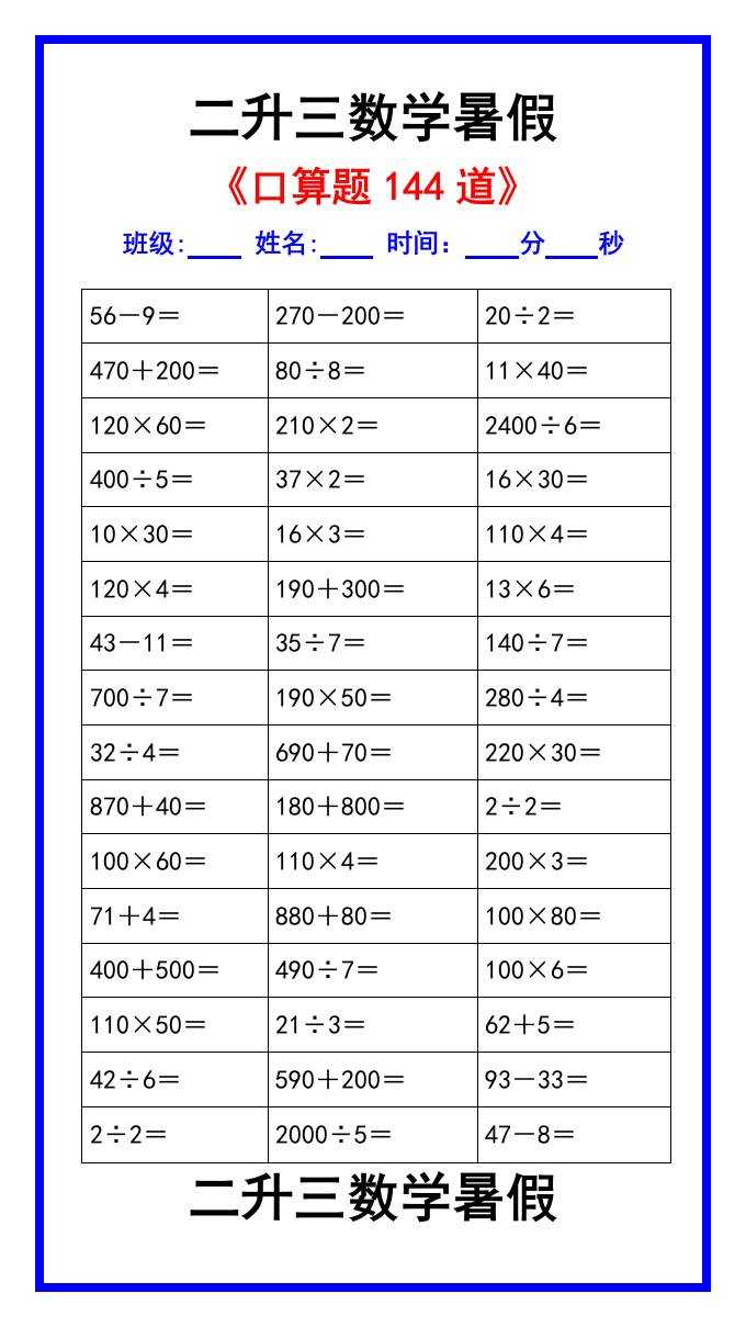 二升三数学暑假《口算练习题144道》汇总-三上数学 二升三数学暑假《口算练习题144道》汇总-三上数学