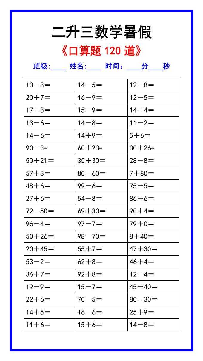 二升三数学暑假《口算练习题120道》汇总-三上数学 二升三数学暑假《口算练习题120道》汇总-三上数学