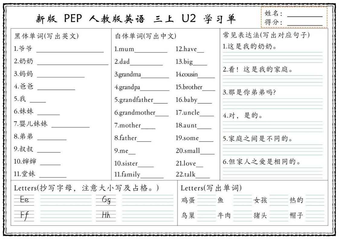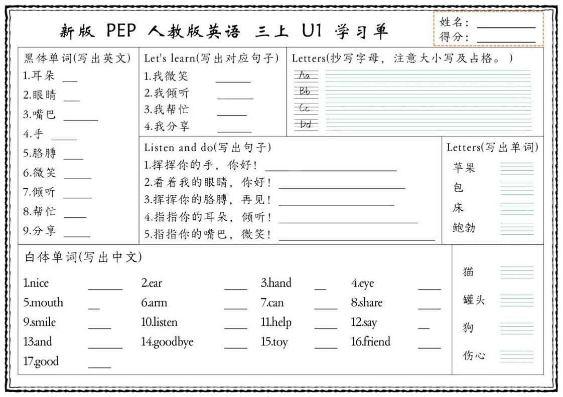 新版三上英语U1-U6单元学习单(人教PEP) 新版三上英语U1-U6单元学习单(人教PEP)