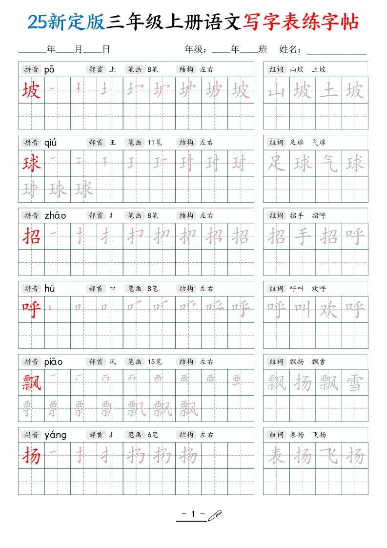 25新定版三上语文写字表练字帖(拼音笔顺组词描红250字)42页 25新定版三上语文写字表练字帖(拼音笔顺组词描红250字)42页