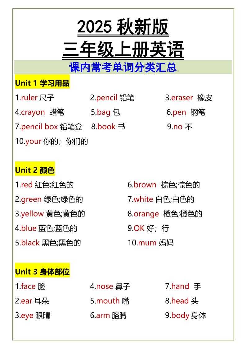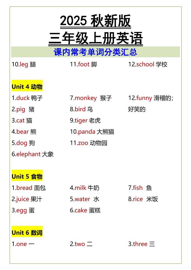 【2025秋新版】三年级上册英语课内常考单词分类汇总 【2025秋新版】三年级上册英语课内常考单词分类汇总