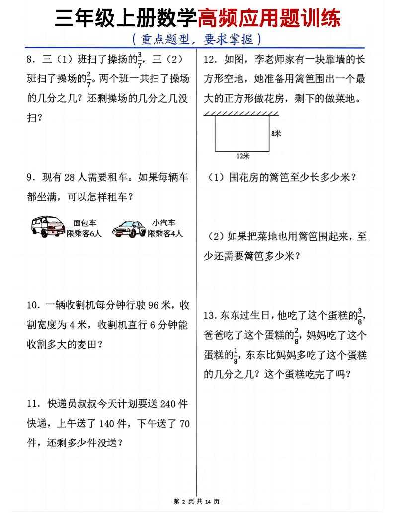 三年级上数学高频应用题训练 三年级上数学高频应用题训练
