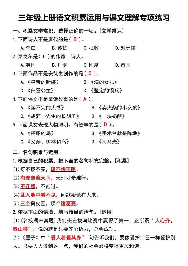 三年级上册语文积累运用与课文理解专项练习 三年级上册语文积累运用与课文理解专项练习