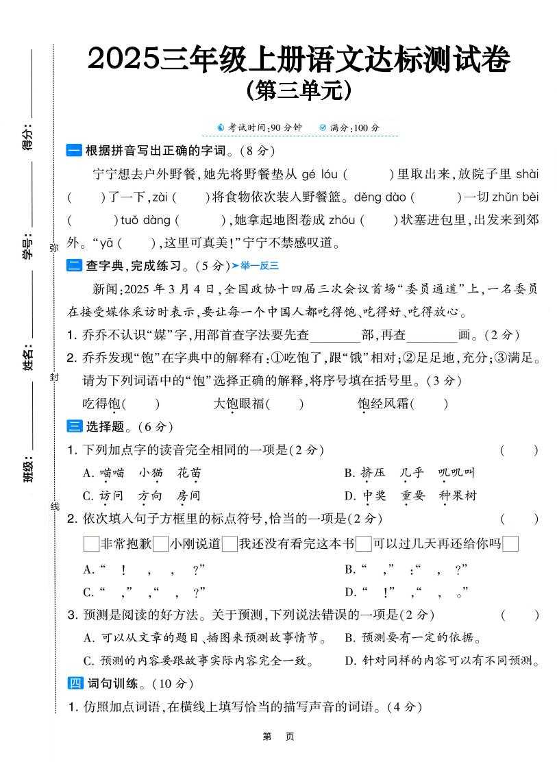 25三上语文第三单元达标测试卷(含答案5页) 25三上语文第三单元达标测试卷(含答案5页)