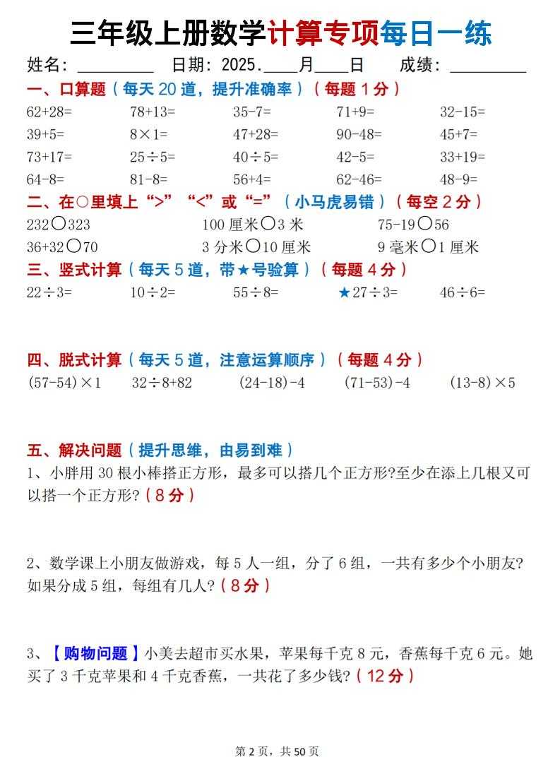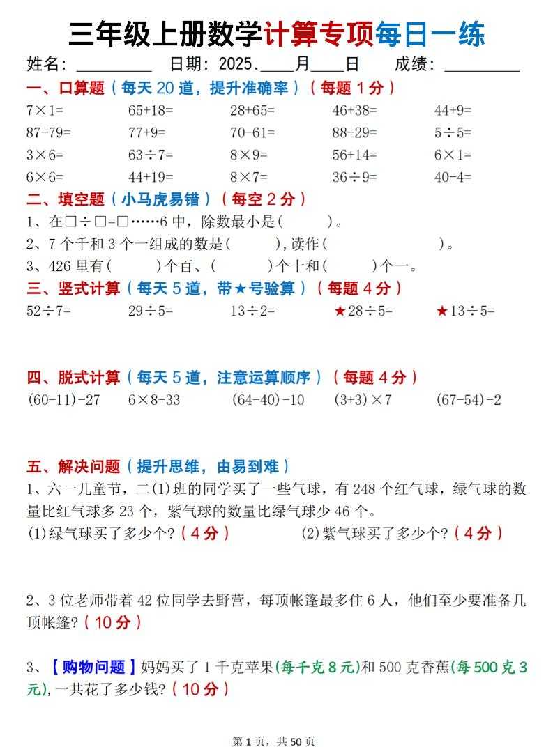 三上数学计算专项每日一练50天(口算填空竖式脱式解决问题思维题)50页 三上数学计算专项每日一练50天(口算填空竖式脱式解决问题思维题)50页