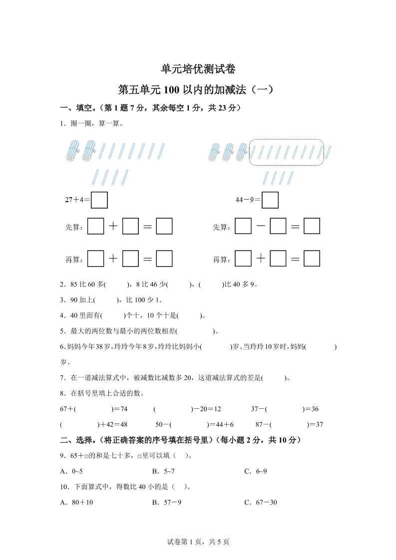 青岛63版数学一年级下册第五单元《100以内的加减法(一)》单元测试卷 青岛63版数学一年级下册第五单元《100以内的加减法(一)》单元测试卷