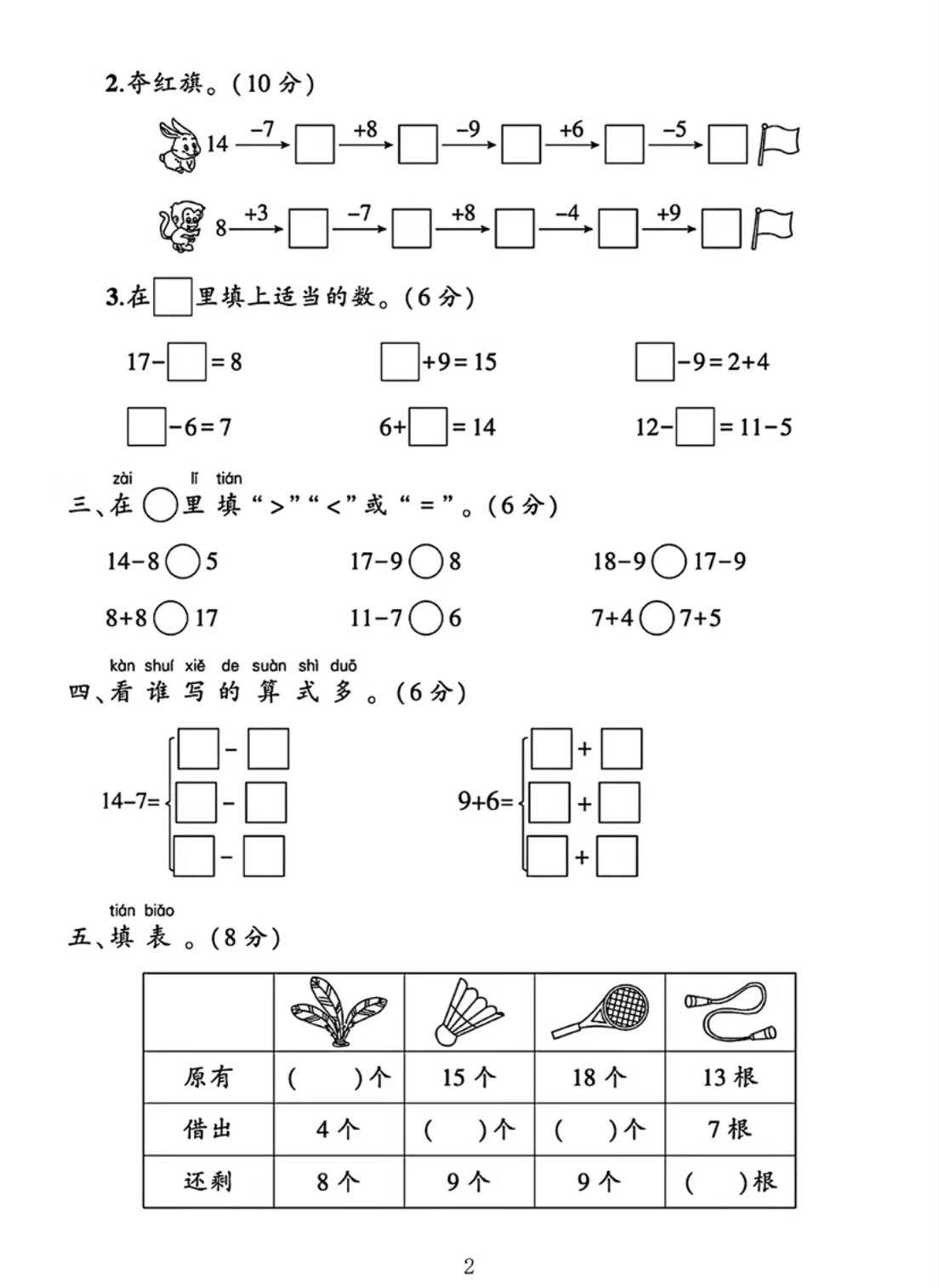 25春一下苏教版数学第一单元《进位加法和退位减法》测试卷4页 25春一下苏教版数学第一单元《进位加法和退位减法》测试卷4页