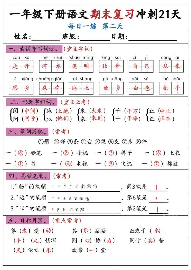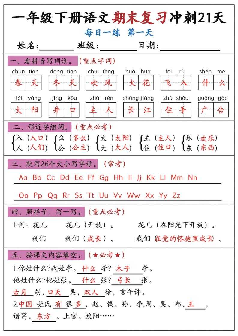 新一下语文期末复习冲刺21天答案版 新一下语文期末复习冲刺21天答案版