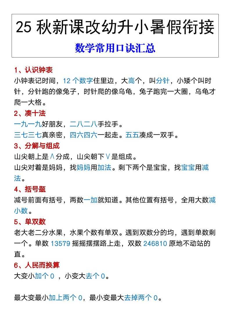 【2025秋新版】幼升小暑假衔接数学常用口诀汇总-一上数学