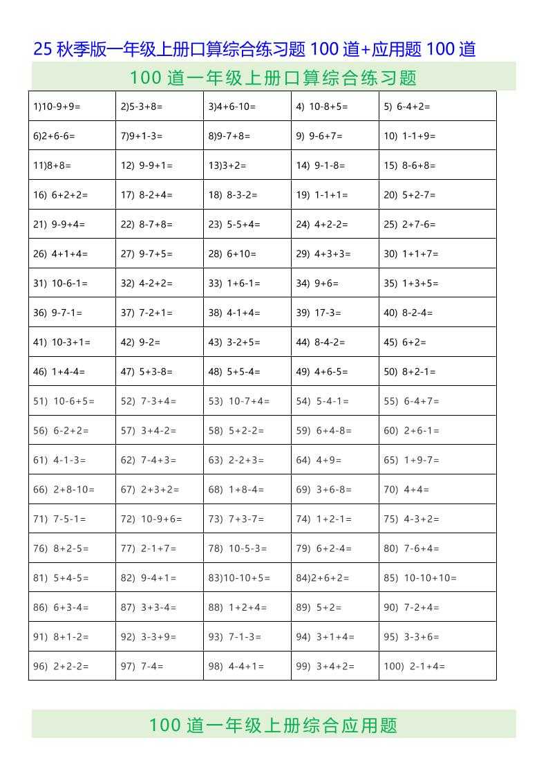 【2025秋新版】一年级上册口算综合练习题100道+应用题100道-一上数学 【2025秋新版】一年级上册口算综合练习题100道+应用题100道-一上数学